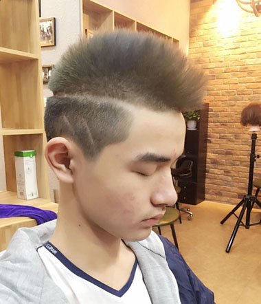 头发的两边铲平,只留下中间的头发,中间的头发做成子弹头的造型,稍长的头发看起来是非常的有酷感的哦,头发的两侧我们选择这样的雕刻的造型,雕刻一道杠的图案,非常的有个性感哦。
