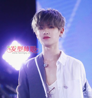 韩版的男生发型,不仅要做出刘海与发型之间的烫卷发处理,也需要给头发做出帅气的染发搭配。范丞丞穿校服时候的内扣括号刘海短发发型,将两边的头发分别做内扣修饰头型。