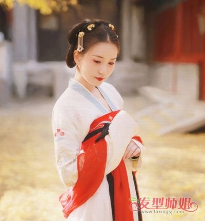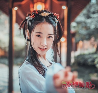 现在流行的是简约清新风,年轻妹子们秋天穿汉服的时候,不要将头发盘的太繁复,就以自己长发为基础,盘成中分刘海半丸子头发髻,用古风发簪点缀下,现代发型就有了复古感觉了。