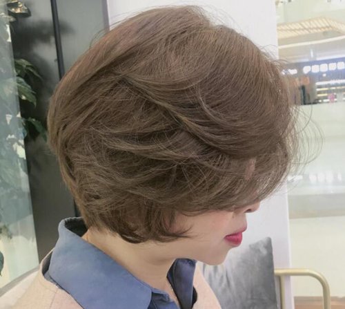 把头发剪短到脖颈位置,然后弄成侧边短后面长造型,并且进行高层次剪碎打薄,再用纹理烫技术处理一下,一款适合中老年女士梳的栗红色斜刘海外翘短发发型就成了。