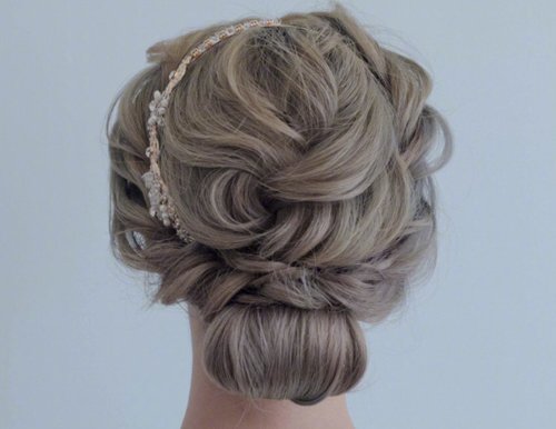 用了水晶发饰环绕了扎发盘发的一圈,让这款卷发交叠完成的立体层次盘发,与后梳低盘发的造型,更要几分阳光的感觉。女生后梳卷发低盘发发型的设计,头型后侧的位置,做出来的发卷更添时尚风情。