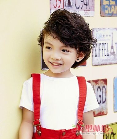 空气感比较明显的小女孩发型,一九分烫短卷发的发型,斜刘海梳在了发际线靠后的位置,短发烫发发型发尾要沿着耳尖梳过去,胖脸小孩都能得到足够的修颜效果。
