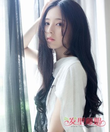 乌黑齐腰长发发尾一点烫卷,弄成蓬松浪漫的小清新少女中分长卷发发型,沿着脸庞两边散落下来,将女生的长脸修饰清秀精致的小脸,演绎出少女的纯美形象和脱俗气质。