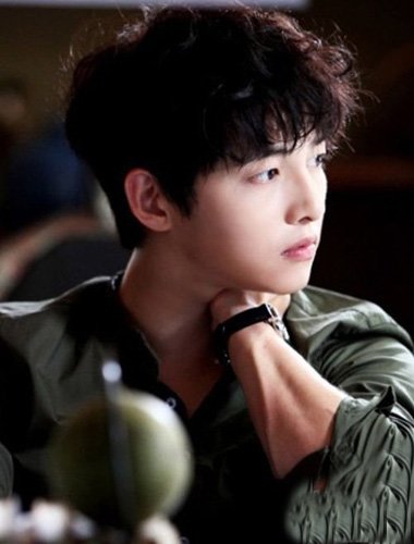影视剧中的宋仲基形象,微卷头发是自然梳下,鬓角部分头发是剪较短,前面刘海部分是修剪出斜效果,帅气风范完美衬托出,耍出男生威风的男生发型打造。